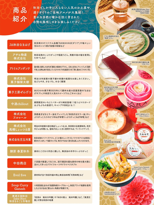 秋田市主催の物産イベントで、農産物や発酵食品、地酒、菓子など秋田の食文化を首都圏へ発信します。今回「美酒王国Sake-Navi秋田まるごと市場店」が初出店し秋田の地酒を販売します。皆さまのご来場を心よりお待ちしております。
