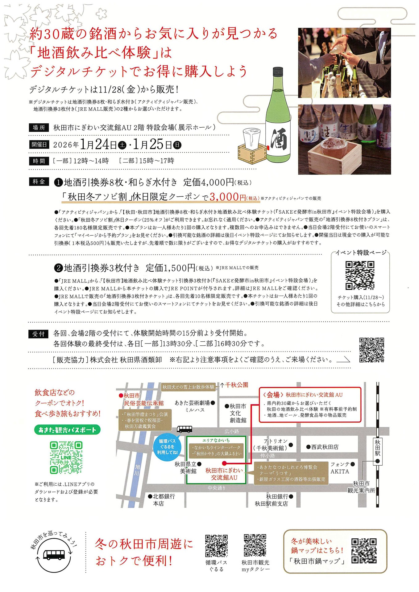 秋田県内約30蔵の地酒飲み比べ体験を中心に、地ビールや発酵食品、地元グルメの販売などを行うイベント。冬の秋田の食と発酵文化を楽しめるほか、郷土料理の振る舞いや関連催しも実施される。